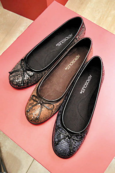 不少女士們都喜愛穿著圓頭的平底鞋,今季AEROSOLES以型格的蛇皮及狂野的豹紋作主打,並配以順滑的馬毛或柔軟的小牛皮作物料,輕巧舒適;圓形的鞋頭上更襯以一隻可愛的蝴蝶結,令女士們於輕狂中散發一點少女氣息。