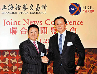 上海證券交易所總經理張育軍(左)和香港交易所行政總裁李小加在新聞發佈會上握手