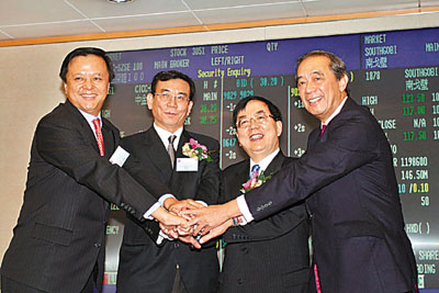 左起:港交所行政總裁李小加、深交所理事長陳東征、中金董事長李劍閣及港交所主席夏佳理出席中金深證100指數上市基金掛牌儀式。
