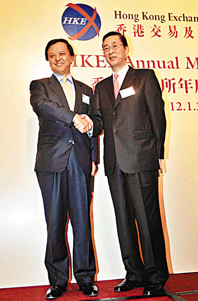 前任港交所行政總裁周文耀(右)與現任行政總裁李小加出席一個午餐會時合照。