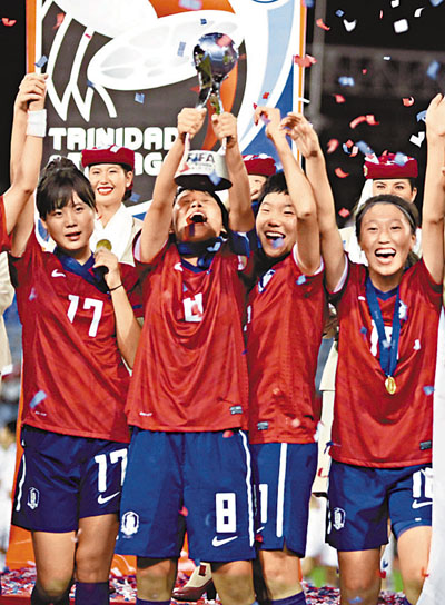 【綜合外電】昨晨在西班牙舉行的女足世少盃決賽,韓國與日本踢至加時仍3:3平手,需要互射12碼,直至踢到第六輪突然死亡,韓國最終贏5:4,首度捧盃(見圖)。而「萬人迷」碧咸亦有出席賽事,當他在賽前與球員握手時,一眾女球員不禁大聲尖叫。