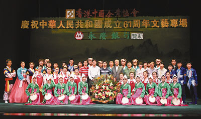 【本報訊】(記者 沈清麗)香港中國企業協會慶祝中華人民共和國成立61周年文藝專場,前日假北角新光戲院隆重上演。這台文藝晚會首次邀請到「長白朝鮮族自治縣民族歌舞團」來港獻藝,邀請香港市民觀賞具濃厚朝鮮少數民族特色的歌舞節目,歡慶祖國華誕,還有河北雜技集團魔術團、安徽省藝術團同台獻藝,熱情飽滿的朝鮮族、漢族歌舞,加上高難度的雜技、魔術表演,真是精彩紛呈,吸引了逾800名中資機構負責人、中企協會會員一同欣賞。