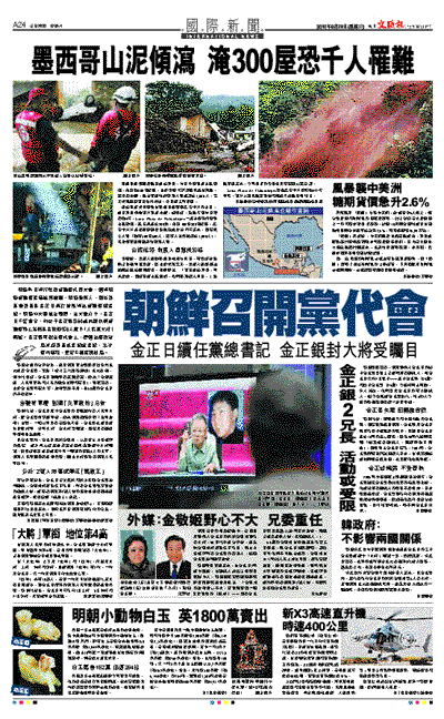 朝鮮昨日舉行執政勞動黨代表大會,選舉朝鮮勞動黨最高指導機關,朝鮮領導人、國防委員會委員長金正日再次被推舉為勞動黨總書記。朝鮮中央通訊社報道,在大會前夕,金正日下達命令,向幼子金正銀及64歲的親妹兼勞動黨輕工業部長金敬姬等6人賦予「人民軍大將」稱號。金正銀可能在黨代會上,獲選為黨政治局常務委員或書記處書記,出掌黨內高職,奠定平穩接班格局。