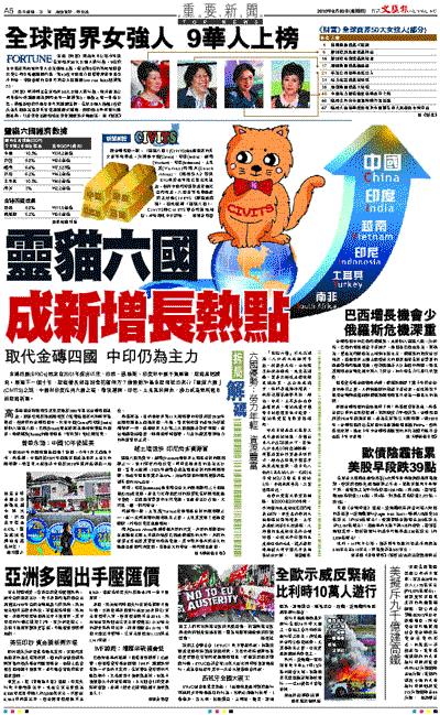 金磚四國(BRICs)概念自2001年提出以來,巴西、俄羅斯、印度和中國不負厚望,經濟高速騰飛。展望下一個十年,經濟增長熱點將會花落何方?倫敦對沖基金經理近日流行「靈貓六國」(CIVITS)之說,中國和印度位列六國之首,帶領越南、印尼、土耳其和南非,接力成為眾所矚目的經濟新星。