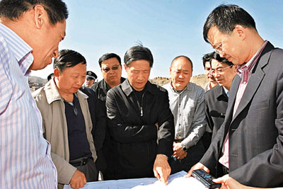 ■新疆黨委常委、烏魯木齊市委書記朱海侖(中),市委常委、常務副市長張鴻(右二),市政協副主席、建委黨組書記馮瑞玉(左二)等市領導在棚戶區改造工程現場指導工作。