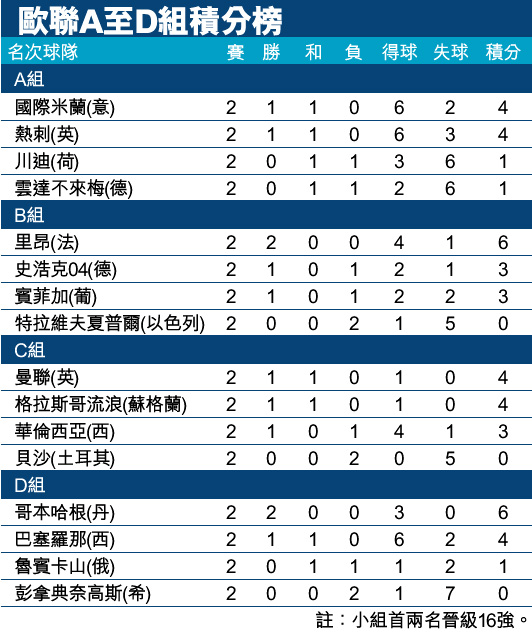 歐聯A至D組積分榜