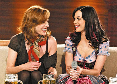 「生化女」美娜祖維華茲(Milla Jovovich)與Katy Perry(見圖)於當地時間星期六晚出席德國遊戲節目《Wetten Dass》。在節目上二人大玩特玩,美娜祖維華茲一出場已經成為焦點,更在節目上大擺「甫士」,又與Katy Perry有說有笑,看來她在節目中玩得非常開心。 ■文︰Wyman/圖:路透社