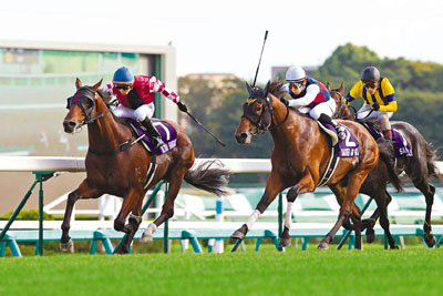 ■「極奇妙」(左)出閘後立即採取主動,上前佔欄領放,沿途帶頭,最終一放到底,以佳速掄元,勝出國際一級賽短途馬錦標。
