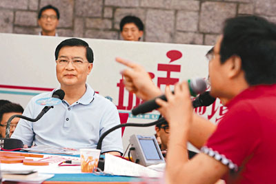 此外,「維園阿哥」也不忘對民主黨發難,一發言即指何俊仁講的意見是「阿媽是女人的道理」,又稱見到何俊仁發言時有許多觀眾「打瞌睡」。■香港文匯報記者 鄭治祖