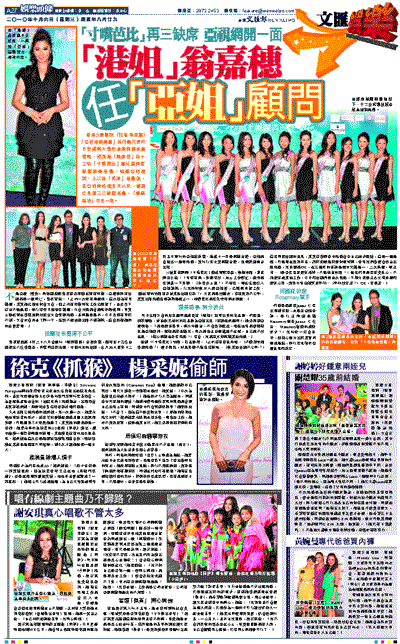 昨日出席大會的形象顧問團成員有「港姐」冠軍出身的翁嘉穗、何國鉦、胡敏珊等,被指倒戈相向的翁嘉穗為亞姐出任「美麗風采顧問」,她否認到亞視踩場:「都是選美盛事,無分什麼台,不會覺得尷尬,而且06年都曾經擔任過亞姐評判,港姐都有邀請我,每次都撞正暑假檔期不在港,自己都不好意思。(擔心無線指你唔畀面?)唔會,我都有支持無線其他活動。」