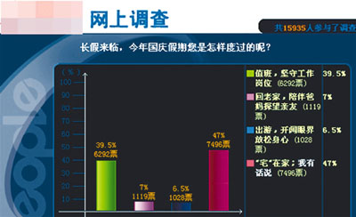 人民網日前展開「長假來臨,今年國慶假期您是怎樣度過的呢?」的網路調查,截至7日11時,共有15935人參與調查。調查顯示,表示長假「宅在家」的內地網友共有7496人,佔調查總數的47%;表示要「值班,堅守工作崗位」的網友有6292人,佔39.5%;表示要「回老家,陪伴爸媽探望親友」的網友有1119人,佔7%;表示要「出遊,開闊眼界放鬆身心」的網友有1028人,佔調查總數的6.5%。