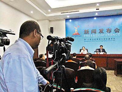 東南亞華文媒體高層採訪團在亞組委新聞發佈會現場 香港文匯報記者梁聲劍 攝