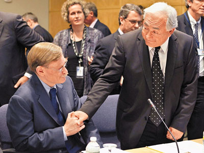 ■IMF總裁斯特勞斯.卡恩(右)與世銀行長佐利克(左)會面時握手。路透社