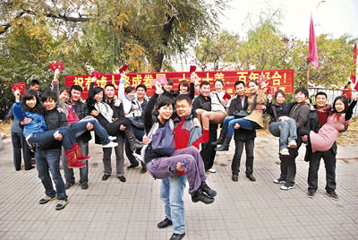 ■10日,在哈爾濱,10對領到結婚證的新人合影留念。新華社