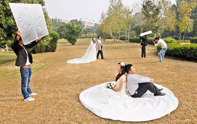 許多婚紗攝影師、婚禮跟拍師昨日都忙得停不住腳,但也看荷包豐滿,再累也高興。新華社