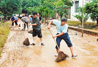 ■10日,洪水退去後,文昌市後坡村的村民在清理道路淤泥。 新華社