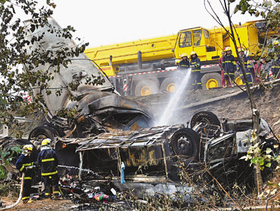 ■槽罐車疊壓在大客車上,消防人員在事故現場滅火。 新華社