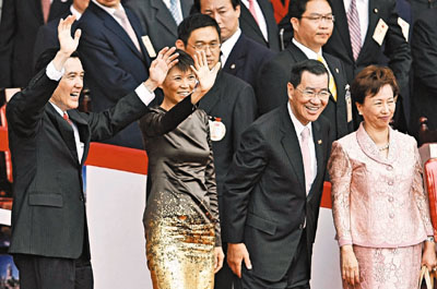 ■在「雙十」慶典上,(前左起)馬英九及夫人周美青、「副總統」蕭萬長及其夫人朱俶賢向與會者揮手致意。 中央社