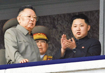 ■金正恩(右)與父親金正日一起在主席台觀看了閱兵式。鏡頭中可以發現金正日的臉上長出了以前沒有的黑斑。美聯社
