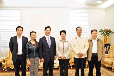 ■河南省副省長孔玉芳(右三)與香港《文匯報》社長王樹成合影。