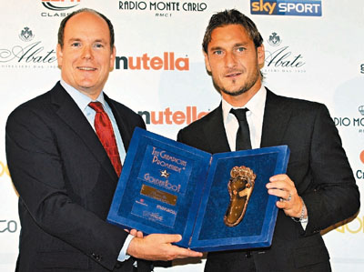 羅馬意大利球星托迪(右)獲得2010年金足獎,該年度獎項由摩納哥王室贊助,表彰在足壇有傑出成就的29歲以上球員。 法新社