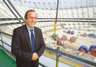 ■歐洲足聯主席柏天尼昨日到波蘭首都華沙,視察2012年歐洲國家盃的球場準備工作。路透社