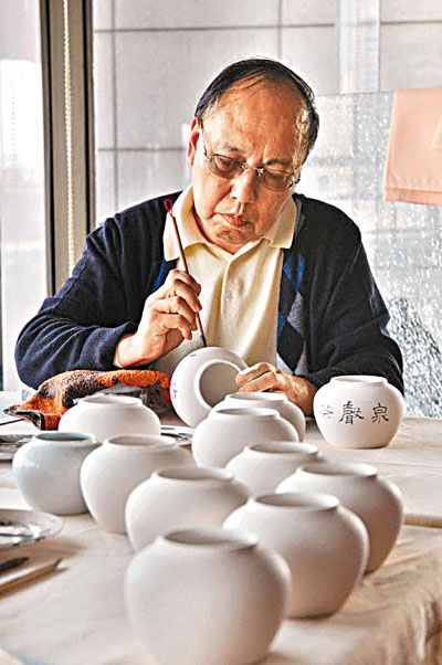 ■書法家徐雲叔在繪製罐身。 香港文匯報上海傳真