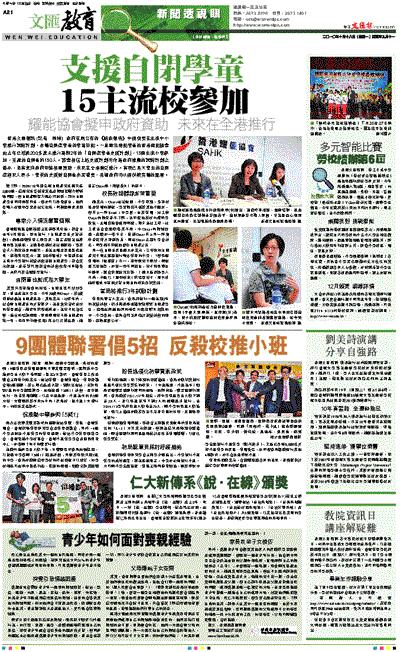 香港文匯報訊 (記者 周婷) 政府在剛公布的《施政報告》中提到要在主流中小學推行試驗計劃,改善自閉症學童的學習效能。一直關注弱能學童的香港耀能協會由去年已撥款200多萬元推行為期2年的「自閉症學童支援計劃」,15間主流小學參加,受惠的自閉童約150人。該會相信上述支援計劃可作為政府推動的試驗計劃之藍本,並有意向政府申請相關資助,未來在全港廣泛推行。有現已是大學生的自閉症過來人表示,學校的支援對自閉童非常重要,希望政府可以提供較完善的配套。
