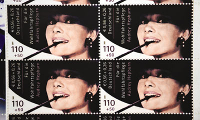 以荷里活影星柯德莉夏萍(Audrey-Hepburn)劇照為圖案的10張郵票,在柏林時間10月16日舉行的拍賣會以43萬歐元(約466萬港元)的高價賣出,收益所得則作為慈善用途。郵票以柯德莉夏萍在1961年的電影《珠光寶氣》(breakfast at tiffany's)扮演貪慕虛榮的農村姑娘口銜黑色煙斗之肖像作圖案。德國郵政當局曾於2001年印製了1400萬枚,惟夏萍兒子Sean Ferrer認為郵票改動了母親戲中的形象,便以版權為由,拒絕當局使用其母親的肖像權,郵政局更要銷毀郵票。但Sean Ferrer近日同意把他持有的10張郵票作慈善拍賣,收益的3分之2捐至柯德莉夏萍兒童基金會,以資助非洲兒童的教育;餘下的將捐獻給聯合國兒童基金組織,柯德莉夏萍可謂遺愛人間。■文︰Wyman