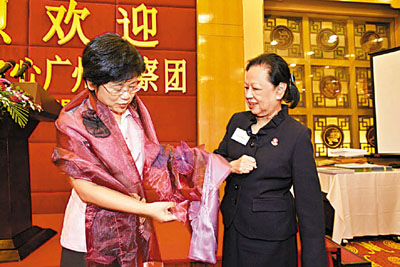 董太致送群力資源中心婦女工作坊製作的圍巾予廣東省政協副主席溫蘭子(左),溫蘭子當場披上。