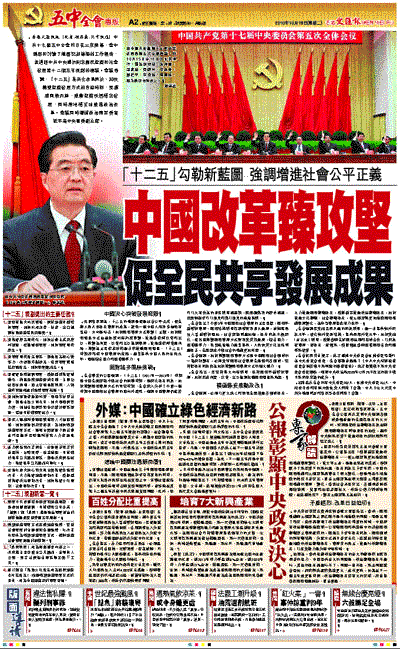 香港文匯報訊(記者 胡海巖 北京報道)中共十七屆五中全會昨日在北京閉幕,會中聽取和討論了總書記胡錦濤的工作報告,並通過中共中央關於制定國民經濟和社會發展第十二個五年規劃的建議。會議強調,「十二五」是深化改革開放、加快轉變經濟發展方式的攻堅時期,要繼續刺激內需,推動經濟快速穩定發展,同時積極穩妥地推進政治改革。會議同時增補政治局常委習近平為中央軍委副主席。