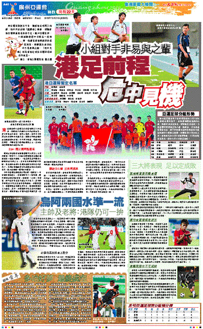 東亞運金牌價比千金,讓香港足球再次抬頭;但本月初出戰「龍騰盃」賽事,卻讓香港亞運隊看到自身的不足。廣州亞運在即,小組抽籤避過中日韓等一級強隊,但擋在香港隊面前的烏茲別克、阿聯酋及孟加拉均不是易與之輩,「危中見機」將是香港足球在亞運前程的四字真言。■文:香港文匯報記者 郭正謙
