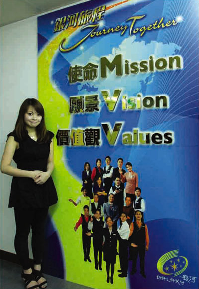 Emily說:「實習初期,部門讓我參與一系列有關員工以及主導培訓計劃,最初不知從何入手,後來,同事告訴我,要成為最優秀的培訓導師,首先要了解公司的背景、文化、使命、願景及價值觀等,還要放開懷抱,以幽默及生動的形式與員工分享。經過多次主導培訓課程,大大增加了個人自信及成功感,並強化了獨立自主的處事方式、人際溝通技巧及應變能力。公司各部門的同事對所有實習生亦師亦友,相處融洽,合作無間,團隊精神便油然而生。」實習期間表現優秀卓越的她,獲得銀娛錄取正式聘用為該集團員工。