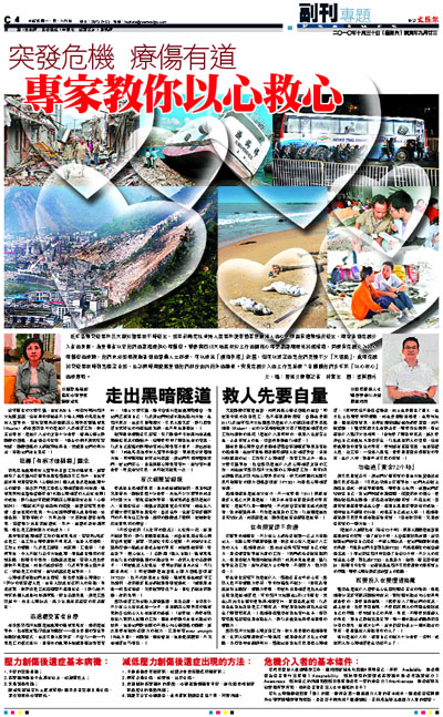 近年各類突發事件及大型災難事故不時發生,如早前馬尼拉脅持人質事件便牽動著無數港人的心。每當有這類情況發生,總會看到危機介入者的身影,為受害者以至他們的家屬提供心理輔導。曾參與四川大地震救災工作的臨床心理學家鄺羅淑兒和楊鴻濤,同樣有危機介入和心理輔導的經驗,他們未必如電視劇看到的專業人士那樣,可以經常「摸酒杯底」敘舊,但可以肯定的是他們見慣不少「大場面」,處理危機和突發事故時都是鎮定自如,在訪問時總能感受到他們那份由內而外的穩重。究竟危機介入的工作是怎樣?且聽聽他們多年來「以心救心」的經歷吧。 ■文、攝:香港文匯報記者 林意生 圖:資料圖片
