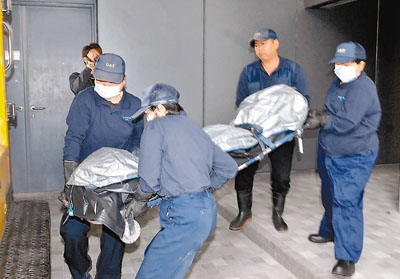 ■仵工把大漢遺體舁送殮房。