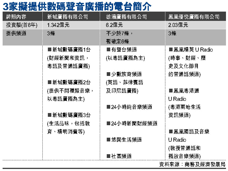 3家擬提供數碼聲音廣播的電台簡介