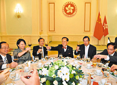 ■行政長官曾蔭權在禮賓府設午宴款待立法會議員,增進議員和特區政府官員的溝通和交流。圖示曾蔭權向嘉賓祝酒。