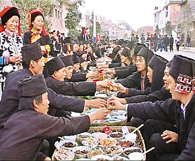 ■哈尼族的民俗活動,皆圍繞梯田豐收這個核心進行。圖為哈尼長街宴一景。