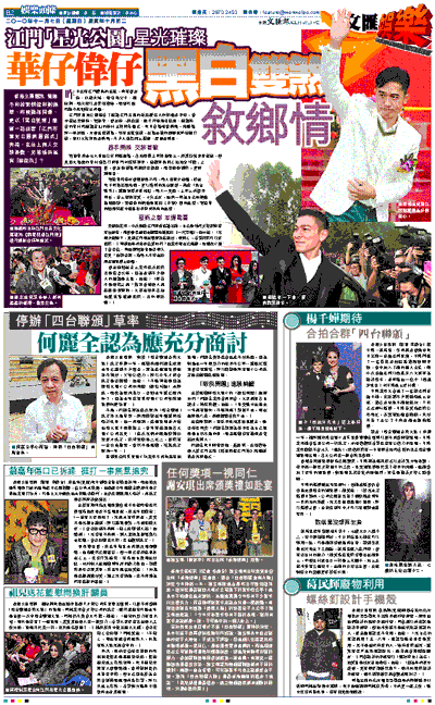 江門市星光公園集合了祖籍江門五邑的歌影視名人的銅像及手印,當中包括梁朝偉、劉德華、曾志偉、譚詠麟、甄子丹等過百紅星。祖籍新會的華仔和祖籍台山的偉仔主持開幕儀式。昨日會場相當熱鬧,活動場所一早封路,方便嘉賓到場,每有嘉賓駕到,在場坐鎮的醒獅隊即敲鑼打鼓,吸引大批市民看熱鬧,不少人索性爬上樹頂、屋頂看明星。