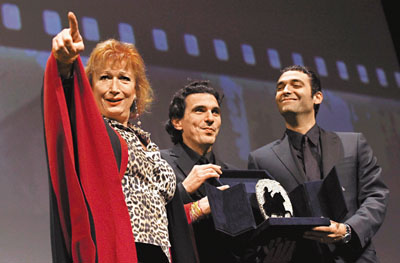 ■法籍導演Olias Barco(中)含羞領獎,Zazie de Paris(左)舉指為他打氣。 路透社