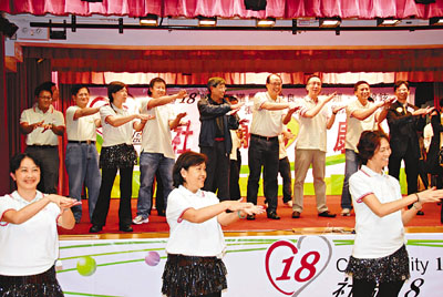 由立會工業界(第二)議員林大輝牽頭成立的「社區18」,昨以「社區身心健康日」作為首個社區活動,正式扎根社區。食物及衛生局副局長梁卓偉到場支持,他卸下官服,與多名區議員大跳「18式健身操」。是次活動更為市民免費體檢,並有「身體及精神健康秘訣」講座。