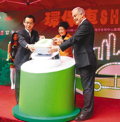 合和實業昨起一連兩天於合和中心廣場舉行環保車Show。在車展開幕禮上,胡文新(左)、潘潔(中)及左禮宜,將巨型充電器插頭與電源接通,象徵環保車展正式開幕。