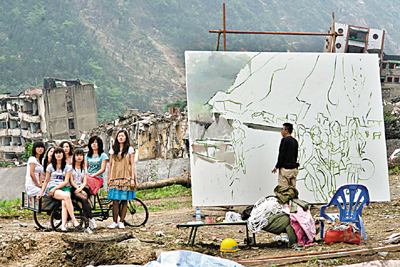 ■本次參加上海雙年展的藝術家,亦在創作中突出了藝術作品的「排演」過程,如劉小東的作品《出北川》,一旁有他在創作期間的草稿。(本報上海傳真)