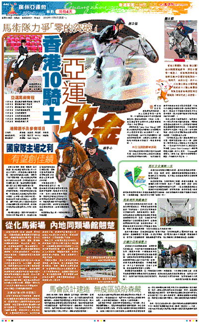 香港文匯報訊(記者 郭正謙) 由08奧運嶄露頭角,再在全運會一鳴驚人,香港馬術隊成為港隊在廣州亞運爭奪獎牌的一路奇兵,由林立信、林子心以及鄭文傑等全運英雄組成的十人騎士軍團將背負起為香港馬術實現亞運獎牌「零的突破」的使命。