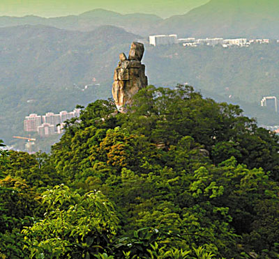 獅子山郊野公園主要由塌積岩及侵入火成岩組成。望夫石是經風化的岩體,又稱突岩;此石原為一塊巨石,其節理平面因受風化而形成直立的石柱、石塊。此石有一個家喻戶曉的傳說:「從前這附近的一個村莊,住了一戶人家,男戶主為了生計遠赴海外工作,留下妻子和兩名子女,從此便杳無音信。他的妻子遂攜兩名子女登上山頂眺望夫歸。有一天,在一場雷雨之後,她和子女便化成石柱。」