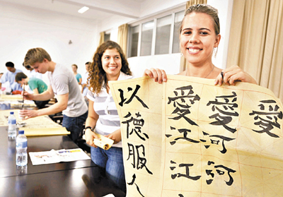 ■德國孔子學院的中學生正在學習書寫毛筆字。 資料圖片