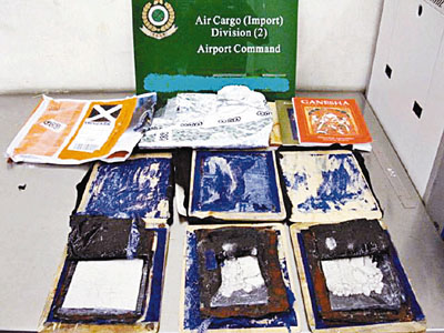 香港文匯報訊(記者 杜法祖)海關前日下午在香港國際機場空運中心,利用X光機檢驗一箱報稱為書本及相架的轉口空運貨,發現3個木製相架暗格藏有390克海洛英,市值約20萬。調查顯示貨物來自印度,準備轉運至內地。差不多同時間,機場速遞中心關員也在一箱報稱為茶壺的轉口貨物中,發現金屬壺真空隔熱層內藏有408克鴉片,市值約11萬元。資料顯示貨物由老撾轉運美國。