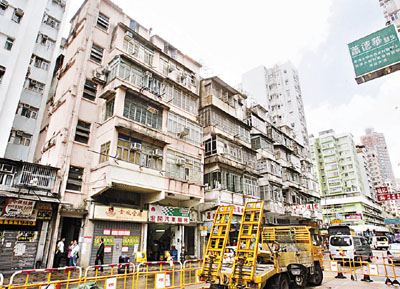 ■順寧道69號一幢舊樓昨晨有石屎剝落。圖為獲市建局斥資重建的順寧道舊樓。 資料圖片
