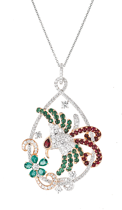 這款色彩繽紛的鏈墜,是系列中最能演繹出Quetzal羽毛色澤的款式。張開的翅膀綴有綠色石榴石,身軀密鑲了白色美鑽,頭部是一顆梨形紅寶石,由凸圓形紅寶石排列而成的尾巴勾著鏈墜的梨形鑽石外框,框架上綴有綠寶石花瓣組成的小花朵。