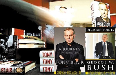 今年很熱鬧,英美政壇的「BB」——英國前首相貝理雅(Blair)和美國前總統布什(Bush)——這對孖寶兄弟前後腳出版自傳。貝理雅的那本在香港能買到美加版,由蘭登書屋旗下的Alfred A. Knopf和Alfred A. Knopf(加拿大)出版,9月初才出版,至今已經是第六版。相信雖然比不上幾年前還是「前美國第一夫人」希拉里的那本自傳賣出天文數字,但也算很暢銷。他的這本書名很文藝,「A Journey」,副標題為「My Political Life」。布什的自傳尚未到港,但新聞已經把他書中如何評點各國元首拿來熱炒。和貝理雅自傳的含蓄書名相比,布什的就相當有他個人特色,「Decision Points」像極了美國流行小說或是電影的名字。